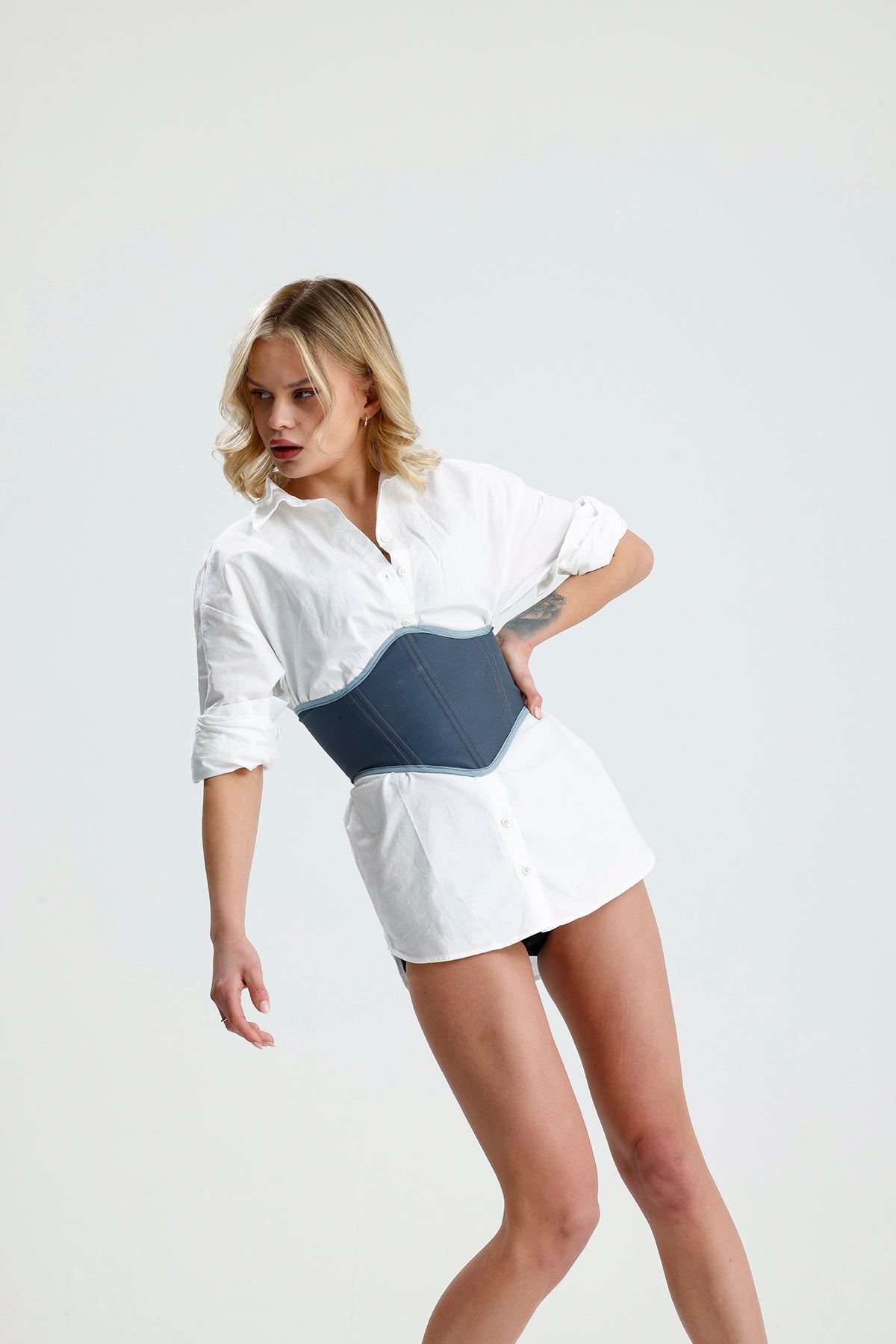 Designad för att lyfta vardagliga plagg är denna korsett tillverkad i ett stadigt vävt tyg som ger både form och komfort. Bär den över skjortor, t-shirts eller klänningar för att markera midjan och tillföra ett modernt, förfinat uttryck till enkla outfits. Lätt men stödjande – perfekt för en smidig övergång från dag till kväll.